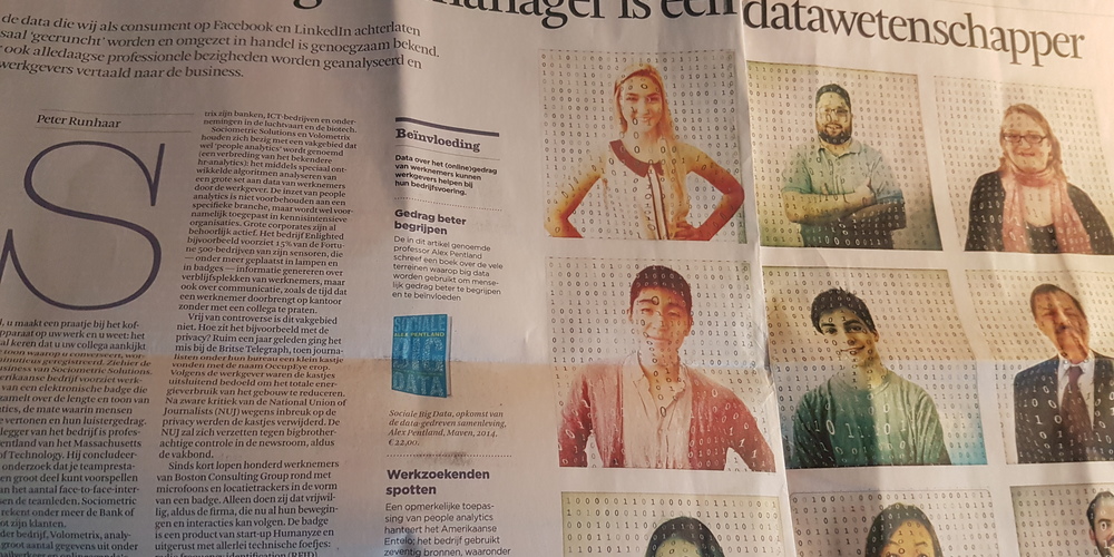 In de Morgen-bijlage geeft het FD voorbeelden die verder gaan. Zo registreert het bedrijf Sociometric Solutions via een elektronische badge nauwkeurig hoe medewerkers met elkaar communiceren (lengte en toon van de conversaties, empathie en luistergedrag). Volgens dit Amerikaanse bedrijf kun je teamprestaties voor een belangrijk deel voorspellen op basis van het aantal face-to-face contacten tussen de medewerkers.