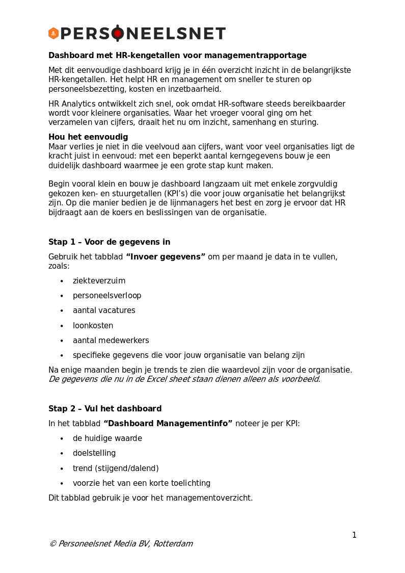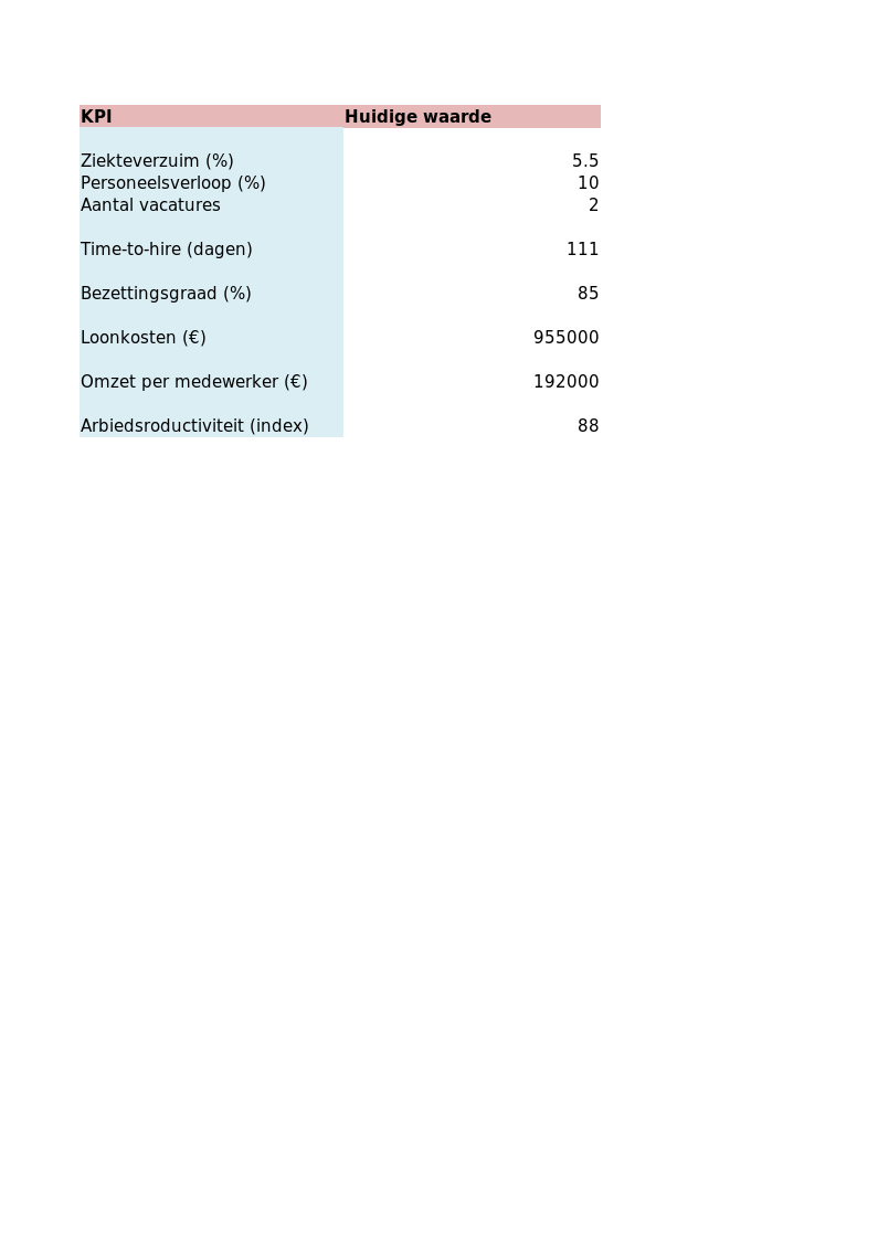 Met dit eenvoudige dashboard geef je in één overzicht inzicht in de belangrijkste HR-kengetallen. Het helpt HR en management om sneller te sturen op personeelsbezetting, kosten en inzetbaarheid.