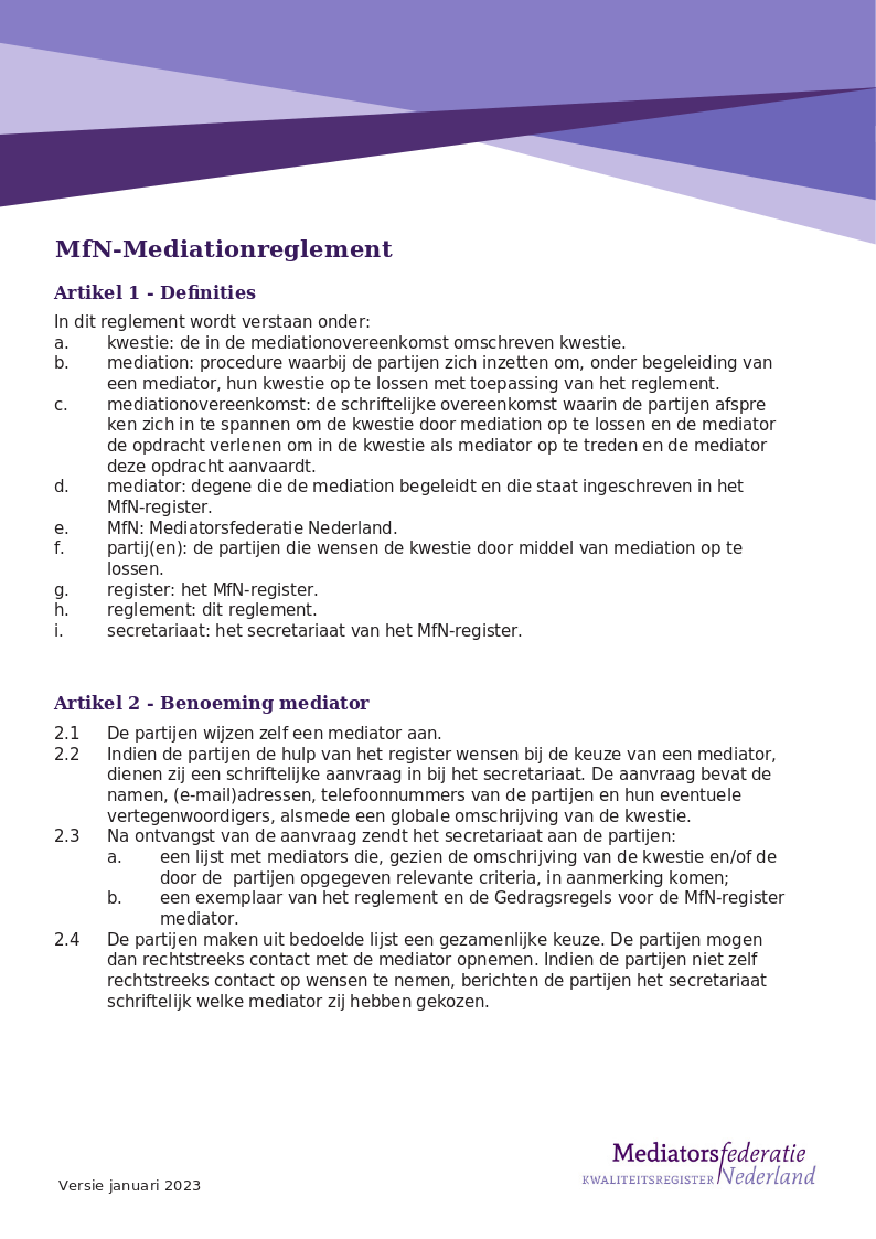 Bij conflicten op het werk die zo hoog oplopen dat werkgever en werknemer er samen niet meer uit komen, kan mediation een oplossing bieden. Mediation is een vorm van conflictbemiddeling onder leiding van een (gecertificeerde) mediator. De mediator stimuleert partijen om tot een werkbare oplossing te komen en bewaakt het proces. Beide partijen binden zich vooraf aan de uitkomst van de mediation. Mediation kan in de plaats komen van een gang naar de rechter.