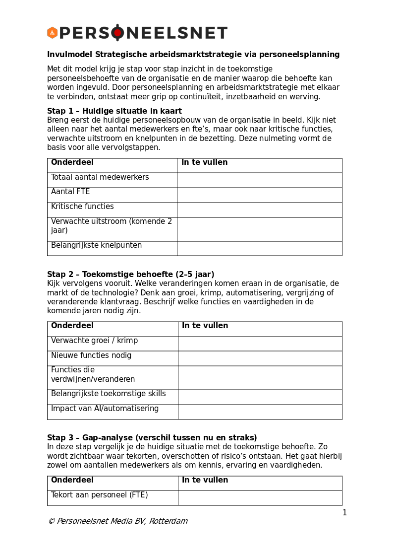 Gebruik dit praktische invulmodel met stapsgewijze toelichting om de toekomstige personeelsbehoefte en arbeidsmarktstrategie voor de komende jaren te bepalen.