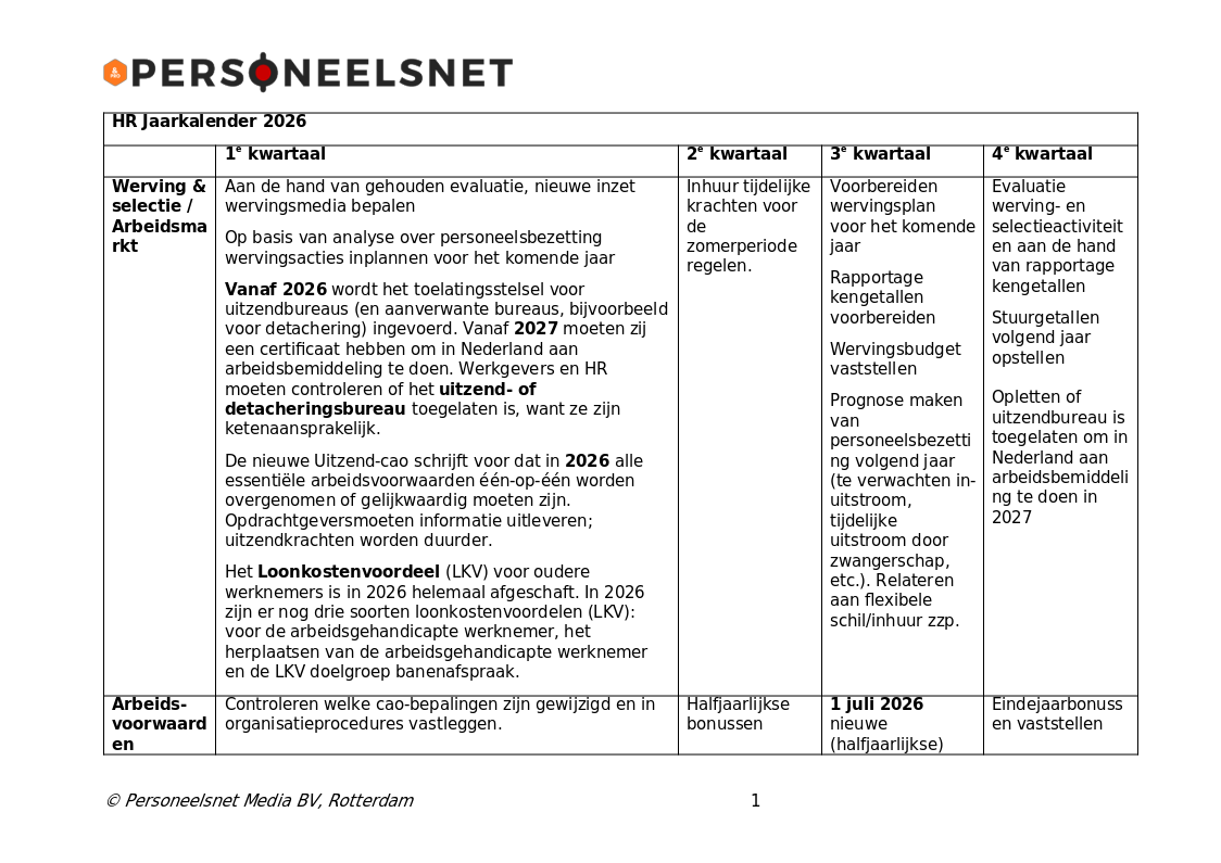 Deze handige HR Jaarkalender geeft per kwartaal voor een aantal deelonderwerpen de activiteiten weer, die bij de HR-afdeling langskomen. De jaarkalender is aangevuld met vakantieperioden en evenementen.