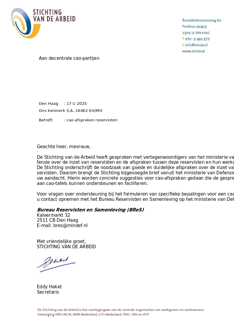 In de praktijk blijkt dat veel organisaties nog geen rekening houden met de inzet van werknemers als reservisten. Afspraken worden dan ad hoc gemaakt, afhankelijk van de leidinggevende of de ruimte in het team. Juist daar wringt het, stellen zowel Defensie als de Stichting van de Arbeid. Zij roepen werkgevers op om dit onderwerp structureel te regelen. Verder hebben werkgevers en vakbonden zich voorgenomen om in nieuwe cao’s kaderafspraken te maken over de inzet van reservisten. (zie de brief hiernaast). Bijvoorbeeld over bijzonder verlof, inkomensaanvulling, pensioen en herstel van arbeidsduur na terugkeer.