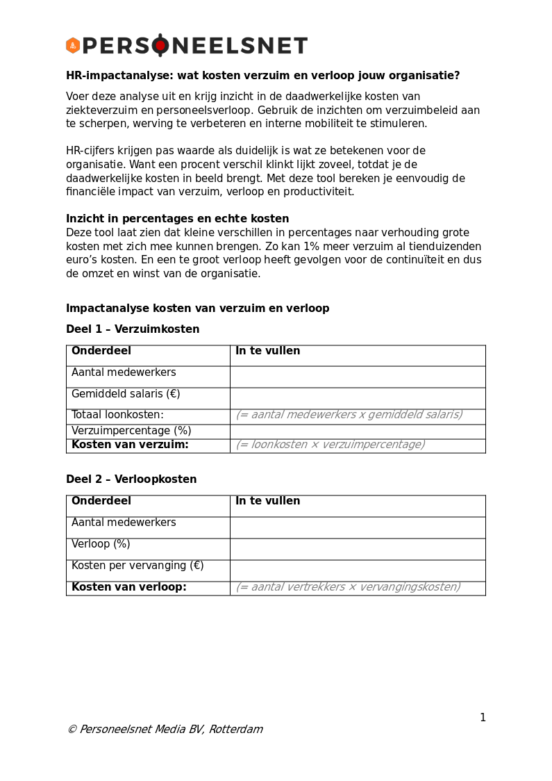 Deze tool laat zien dat kleine verschillen in percentages naar verhouding grote kosten met zich mee kunnen brengen. Zo kan 1% meer verzuim al tienduizenden euro’s kosten. En een te groot verloop heeft gevolgen voor de continuïteit en dus de omzet en winst van de organisatie.