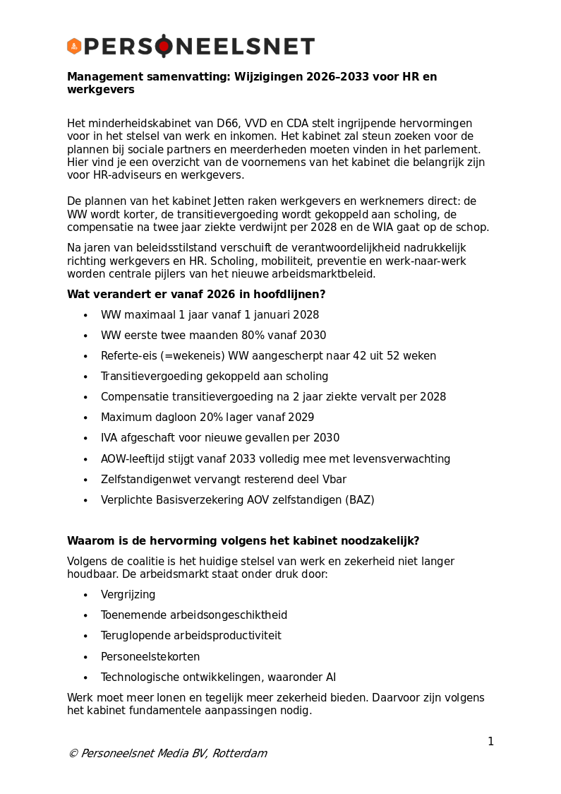 De plannen van het kabinet Jetten raken werkgevers en werknemers direct: de WW wordt korter, de transitievergoeding wordt gekoppeld aan scholing, de compensatie na twee jaar ziekte verdwijnt per 2028 en de WIA gaat op de schop.